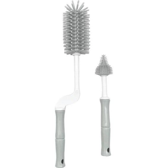 B-Szczotka do butelek i smoczków zestaw Grey Uniwersalny zestaw silikonowych szczoteczek do mycia butelek i smoczków BO JUNGLE sprawdzi się idealnie w kuchni każdej mamy maluszka. W zestawie duża szczotka do butelek i mała - specjalna do mycia smoczków. Szczotka do butelek jest obrotowa, ma wydłużony, ergonomiczny kształt z ugiętą rączką co ułatwia dokładne czyszczenie butelek i innych pojemników. Natomiast mała szczotka jest wyprofilowana, z wypustkami nadaje się idealnie do czyszczenia smoczków, mniejszych akcesoriów i wszelkich zakamarków. Wygodę użytkowania gwarantuje rączka/uchwyt z otworem do zawieszania szczotek w kuchni. Szczotki są łatwe do utrzymania w czystości, należy ją myć ręcznie. Wiek: 0 m+