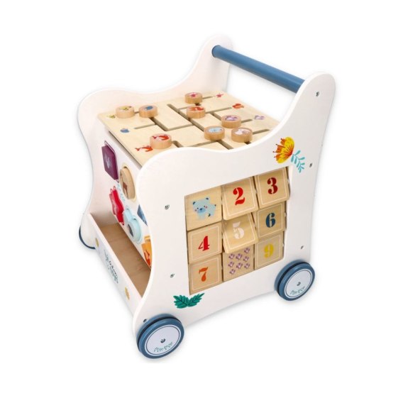 Każdy centymetr tej zabawki do pchania kryje w sobie nowe możliwości zabawy i nauki. Przednia ścianka to prawdziwy festiwal kształtów i kolorów - klocki z uroczymi zwierzakami tylko czekają, by maluch dopasował je do odpowiednich otworów, ćwicząc przy tym rozpoznawanie kształtów, precyzję ruchów i logiczne myślenie. Górny blat to fascynujący labirynt z przesuwnymi elementami, który nie tylko bawi, ale uczy planowania, cierpliwości i rozwiązywania problemów przestrzennych. Boczne panele chodzika to małe dzieła sztuki - piękne, kolorowe ilustracje przedstawiające leśne zwierzęta i rośliny. Na jednej z nich znajduje się piękne drzewo a na nim zagadki czekające na odkrycie przez małego brzdąca. To doskonała okazja do nauki nazw zwierząt, rozpoznawania kolorów i tworzenia własnych opowieści o mieszkańcach lasu. Druga z bocznych części pchacza wyposażona jest w obrotowe elementy z cyframi od 1 do 9 oraz dopasowaną do cyfry liczbą zwierzątek, dzięki którym dziecko w naturalny sposób oswaja się z liczbami i podstawami matematyki. Kolorowe klocki z motywami zwierząt czekają, by maluch układał z nich własne kombinacje, rozwijając zdolności manualne i kreatywność.