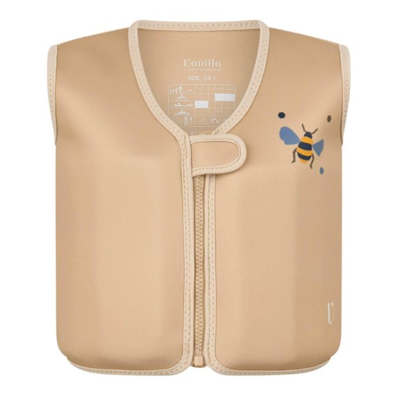 Neoprenowa kamizelka wypornościowa do pływania marki Vanilla Copenhagen dla dzieci w kolorze pięknego beżu z pszczółką na plecach i z przodu, sprawdzi się idealnie podczas nauki pływania i zabawy, aby maluchy w kamizelce mogły pływać jak rybki w wodzie. Kamizelka zwiększa komfort i bezpieczeństwo dziecka w basenach, w parkach wodnych, nam morzem i są to podstawowe cele i elementy kolekcji kąpielowej Vanilla Copenhagen. Kamizelka posiada osiem wewnętrznych pływaków. Zapewniają one pływalność dostosowaną do rozmiaru, potrzeb i umiejętności pływackich dziecka. Wyporność można regulować, wyjmując pływaki z kieszeni wewnątrz kamizelki. Gdy dziecko znajdzie się na odpowiednim poziomie, będzie mogło z łatwością kontrolować swoją pływalność.