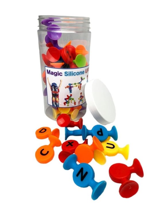 Zabawka rozwijająca kreatywność i zdolności manualne dziecka. Kolorowe klocki silikonowe z literkami pozwalają na naukę alfabetu poprzez zabawę. Przyssawki umożliwiają tworzenie fantastycznych konstrukcji na różnych powierzchniach.