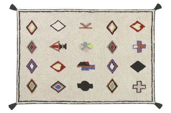 Design: Naturalna baza, na której znajdziemy różne plemienne kształty w miksie kolorystycznym: od jasno rózowego do electric blue i neon green, z czarnymi pomponami w każdym rogu. Kolekcja ta inspirowana jest klasycznym berberyjskim designem z kolorowymi plemiennymi kształtami. Dywan do prania w pralce o pojemności 9kg.