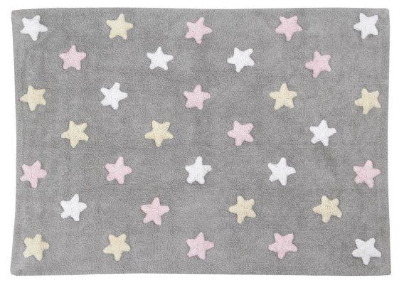 Trójkolorowe gwiazdki Nasze klasyczne gwiazdki świecą jeszcze mocniej! Kolorowe gwiazdki w trzech kolorach na szarym tle to niezbędny dodatek w pokoju dziecięcym. Dywan można prać w pralce o pojemności 6kg.