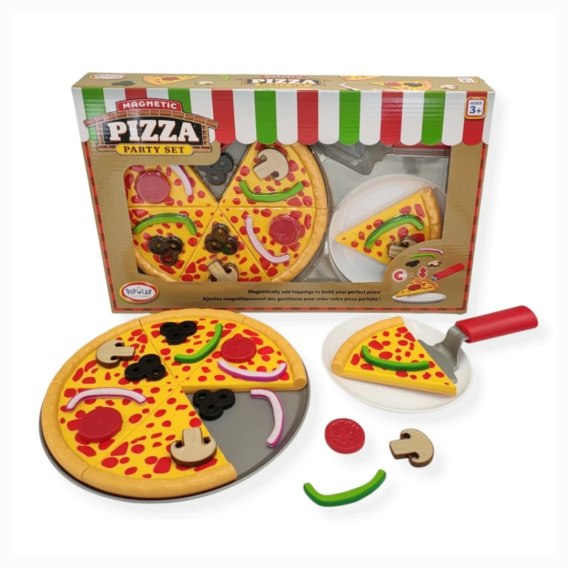 - Ile elementów zawiera zestaw? Zestaw zawiera pizzę podzieloną na 6 kawałków oraz magnetyczne dodatki: pieczarki, oliwki, salami, paprykę i cebulę.