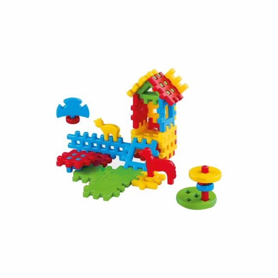 Zestaw zawiera 31 elementów: klocki waflowe, figurki psa i kota, elementy dachu i płotka.