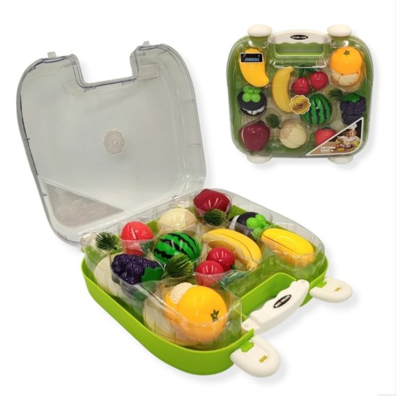 Zestaw zawiera 18 elementów: arbuz, banany, dynię, winogrona, pomidory, truskawki, cebulę, pomarańczę oraz plastikowy nożyk. Wszystko w kolorowej walizce.
